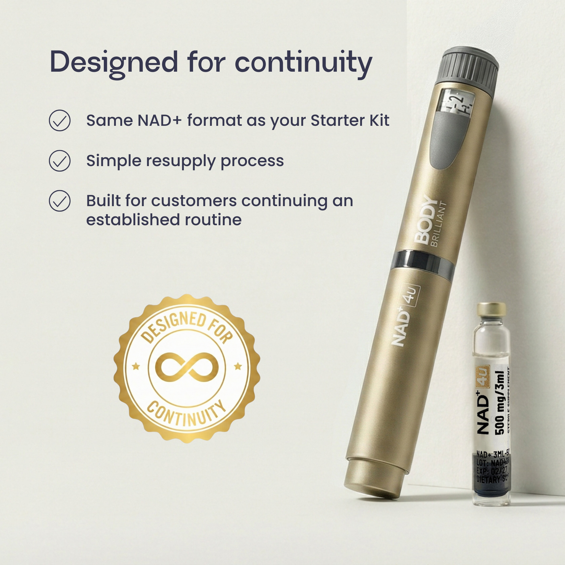 Regular NAD+ replenishment maintains cellular health, energy, and metabolism. The Resupply Kit complements your starter kit, keeping NAD+ levels optimized.